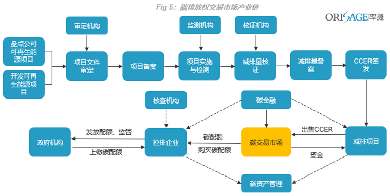 率捷咨詢研究認為,采用碳定價機制,建立健全碳交易市場是各國控制溫室氣體排放的首要選擇。從經濟學的角度出發,由于污染排放具有負外部效應,因此需要講負外部效應內部化,由政府出臺相關政策,落實“誰污染誰付費”的原則。自1997年以來,世界各國相繼建立了屬于自己的碳排放交易體系,碳交易市場規模不斷擴大。中國的碳交易市場也與2021年7月在全國范圍內正式上線交易。碳交易市場主要分為碳抵消、碳控排和碳服務三大板塊;1)碳抵消市場即自愿減排市場(CCER),由自愿減排的企業開發可再生節能減排項目,經政府審定后獲得核證的自愿減排量,可在碳市場交易;2)碳控排即碳配額總量控制與交易市場,被控排的企業要按時履行約定,減少碳排放,擁有碳配額的高排放企業主要有鋼鐵、化工等企業;3)碳服務指圍繞碳交易所的第三方服務,包括為政府或企業提供碳核查、碳資產管理、綠色認證、碳金融服務的等相關企業。