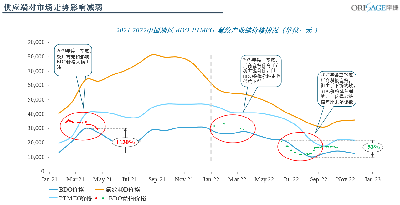 在這種特殊的經濟形勢下,主要因素對BDO市場的影響程度也潛移默化地被改變。往年的BDO市場供不應求,在需求端可以提供持續支撐的前提下,主要市場價格影響因素更多來自供應端的廠商競拍指引及場內現貨供應情況,供應端相對于需求端對市場整體走勢的話語權處于主導地位。由下圖可見,于2021年第一季度,BDO廠商集中進行多次競拍,對市場起到了明顯的指引作用,影響市場價格大幅上漲130%。然而在2022年,失去了需求端的持續支撐后,供應端對市場的指引則不能有效地傳導到價格走勢上。